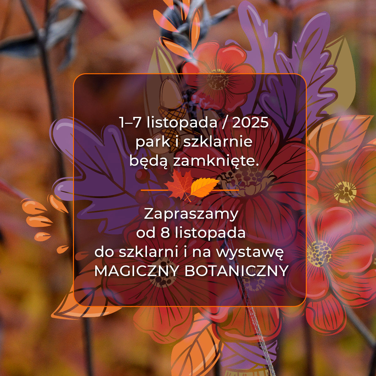 W dniach od 1 do 7 listopada zarówno park, jak i szklarnie ogrodu będą zamknięte. Od 8 listopada zapraszamy do naszych czterech szklarni, które w sezonie zimowym będą czynne w weekendy i święta w godzinach 11.00 – 16.00 … oraz na wystawę Magiczny Botaniczny!