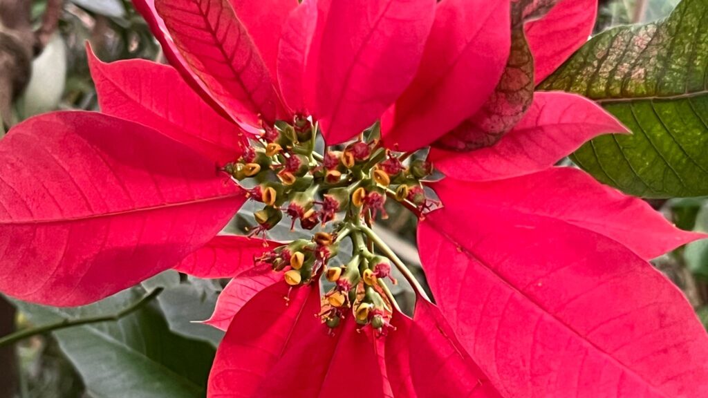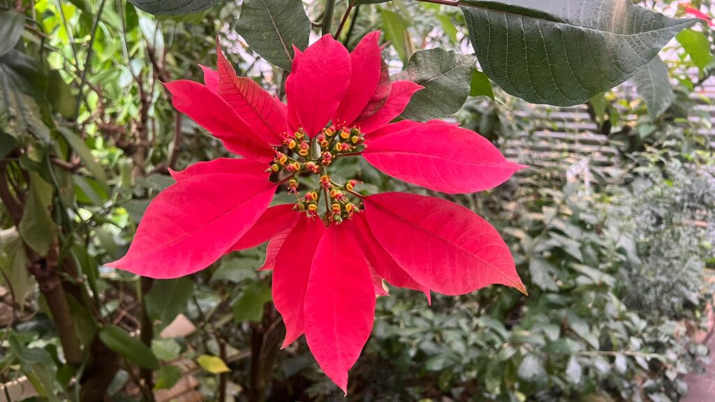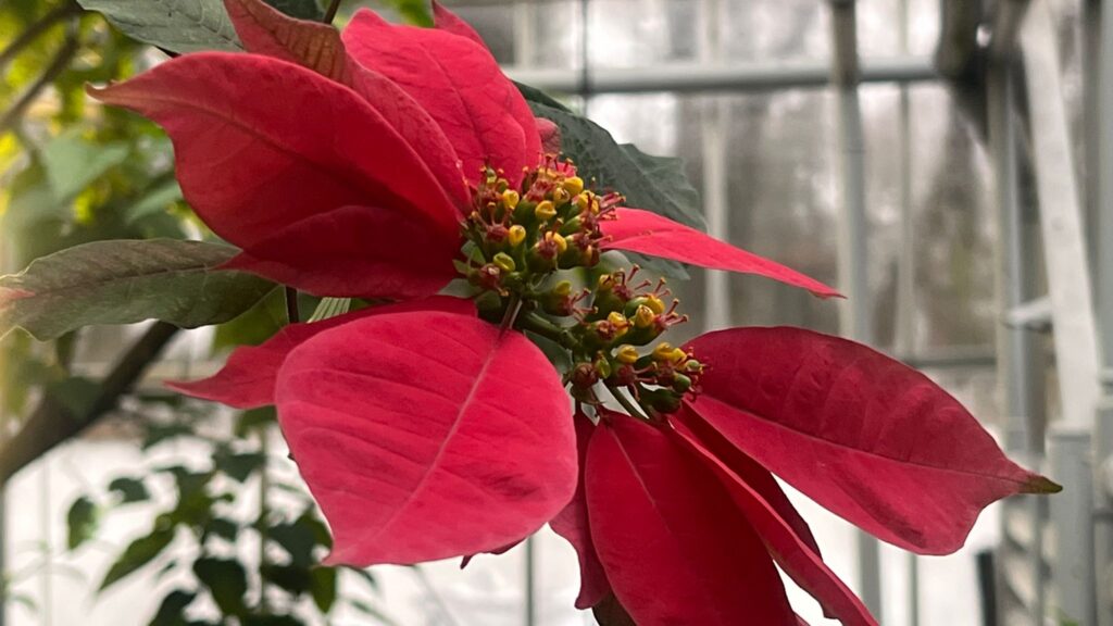 W naszej subtropikalnej szklarni rozkwita już „Gwiazda Betlejemska”. Nazwa pochodzi od czerwonego wyglądu jej szczytowych podkwiatków, które kształtem przypominają gwiazdę i kontrastują z zielonymi liśćmi. Tę imponującą roślinę (Euphorbia pulcherrima) możecie właśnie teraz podziwiać!