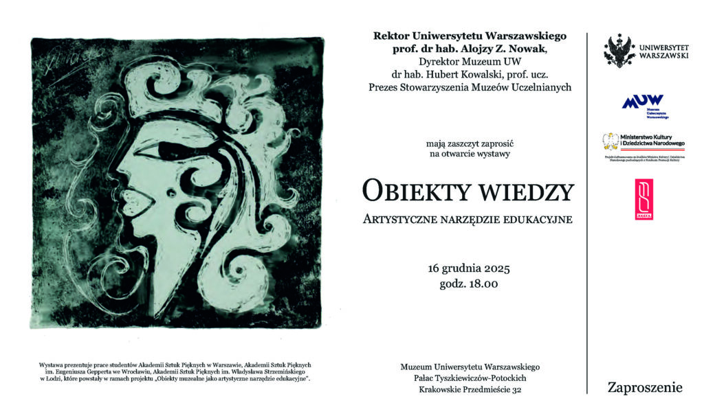 Zapraszamy na otwarcie wystawy OBIEKTY WIEDZY. ARTYSTYCZNE NARZĘDZIE EDUKACYJNE, które odbędzie się 16 grudnia 2025 roku o godz. 18:00 w Muzeum Uniwersytetu Warszawskiego, ul. Krakowskie Przedmieście 32.